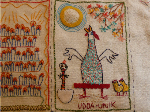 Jag fortsätter med min textila bok och syr mina stygn varje dag. Under april har vi haft påsk och vad passar inte bättre än en höna, kycklingar och påskris.